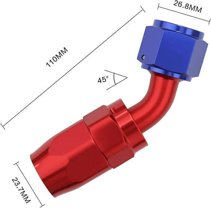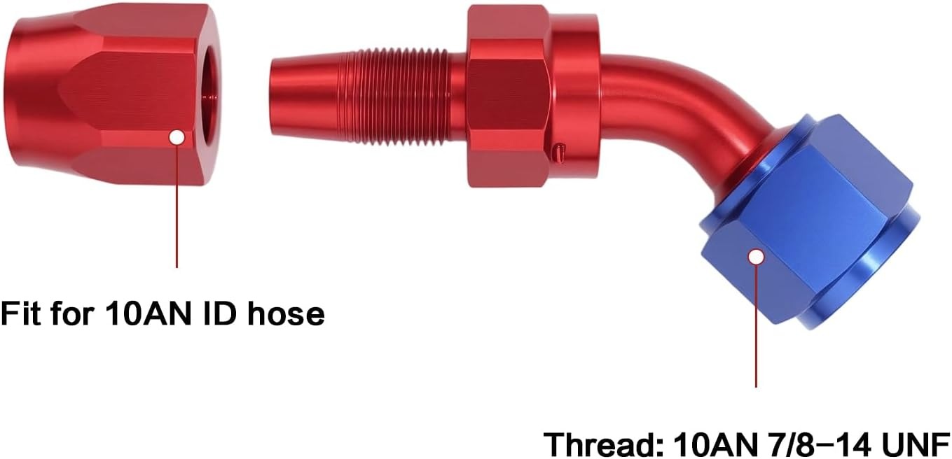 - Tamaño: AN10 (7/8-14 UNF) accesorio de extremo de manguera giratoria, 45 grados. Para uso con manguera trenzada de acero inoxidable y manguera trenzada de nailon. No funciona con manguera de bloqueo de empuje o manguera de PTFE