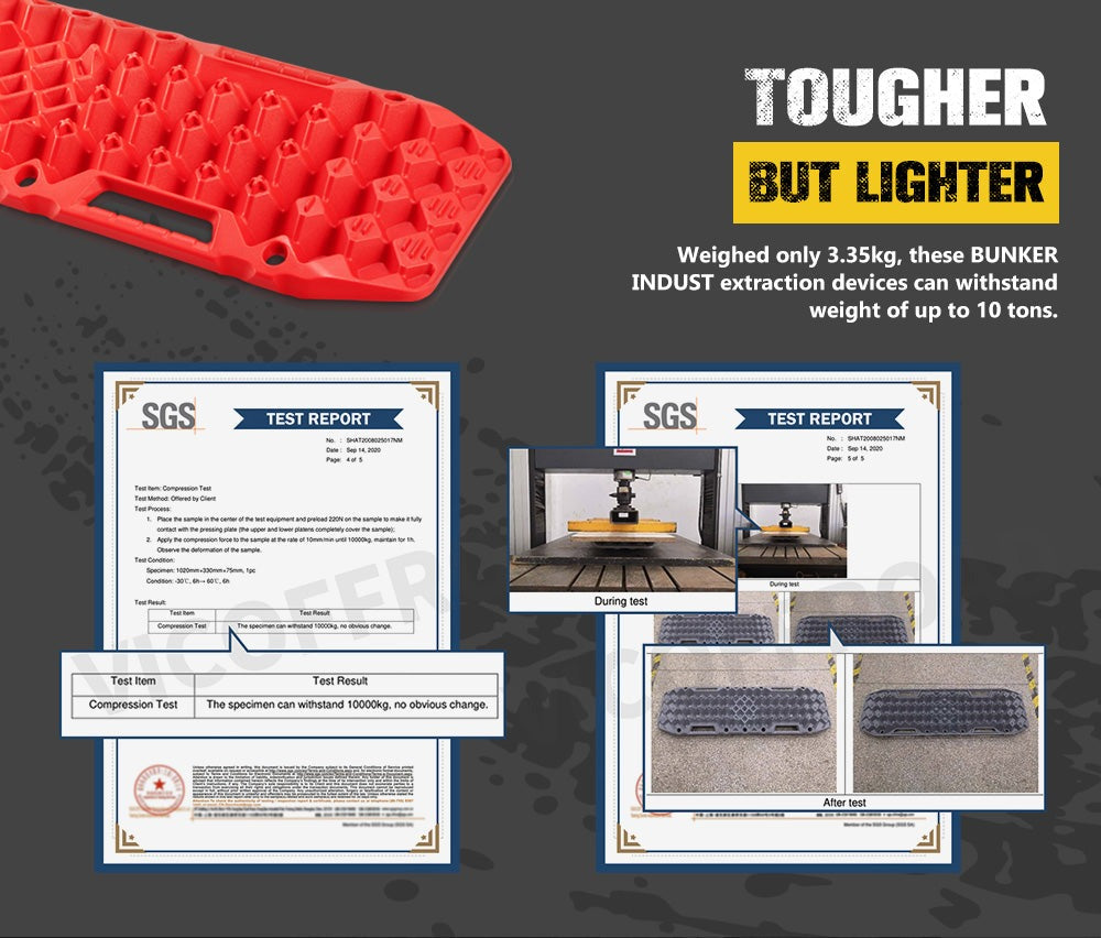 - Tougher But Lighter: Weighed only 5.92kg per pair, these BUNKER INDUST recovery tracks can withstand weight of up to 10 tons.