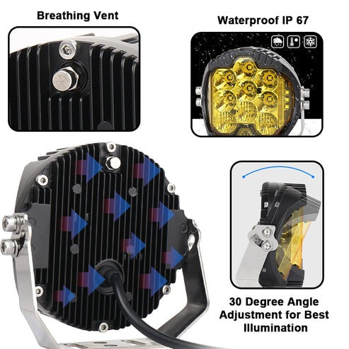 - High Performance - With IP67 protection rating, durable polycarbonate lens, solid cast aluminum housing, multiple heat sink structure, and 100% sealed design,this 5 inch off road work light performs an excellent heat dissipating and waterproof,and can work in rainy, snowy, and foggy days freely.